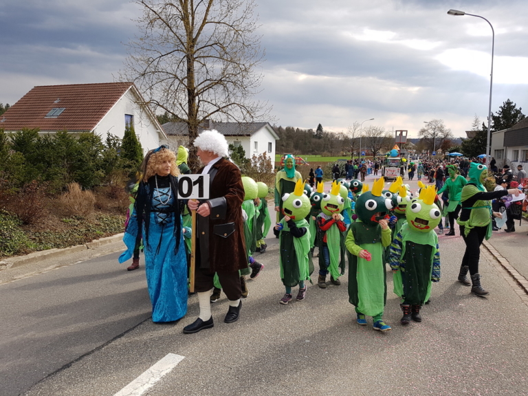 Fasnachtsumzug Riniken 2019 Nachdem im Kindergarten an den vergangenen Regentagen fleissig gekleistert und gemalt wurde, konnten am Sonntag bei Sonnenschein die jungen Froschkönige frei über die gesperrten Strassen von Riniken hüpfen. Gelotst wurden sie von Martha Fischer und Koni Klötzli (Projekt Generationen im Klassenzimmer) als Prinzessin und Prinz, die nach jahrelangem Wohnsitz in Riniken endlich ihren Fasnachtseinstand feiern durften.
